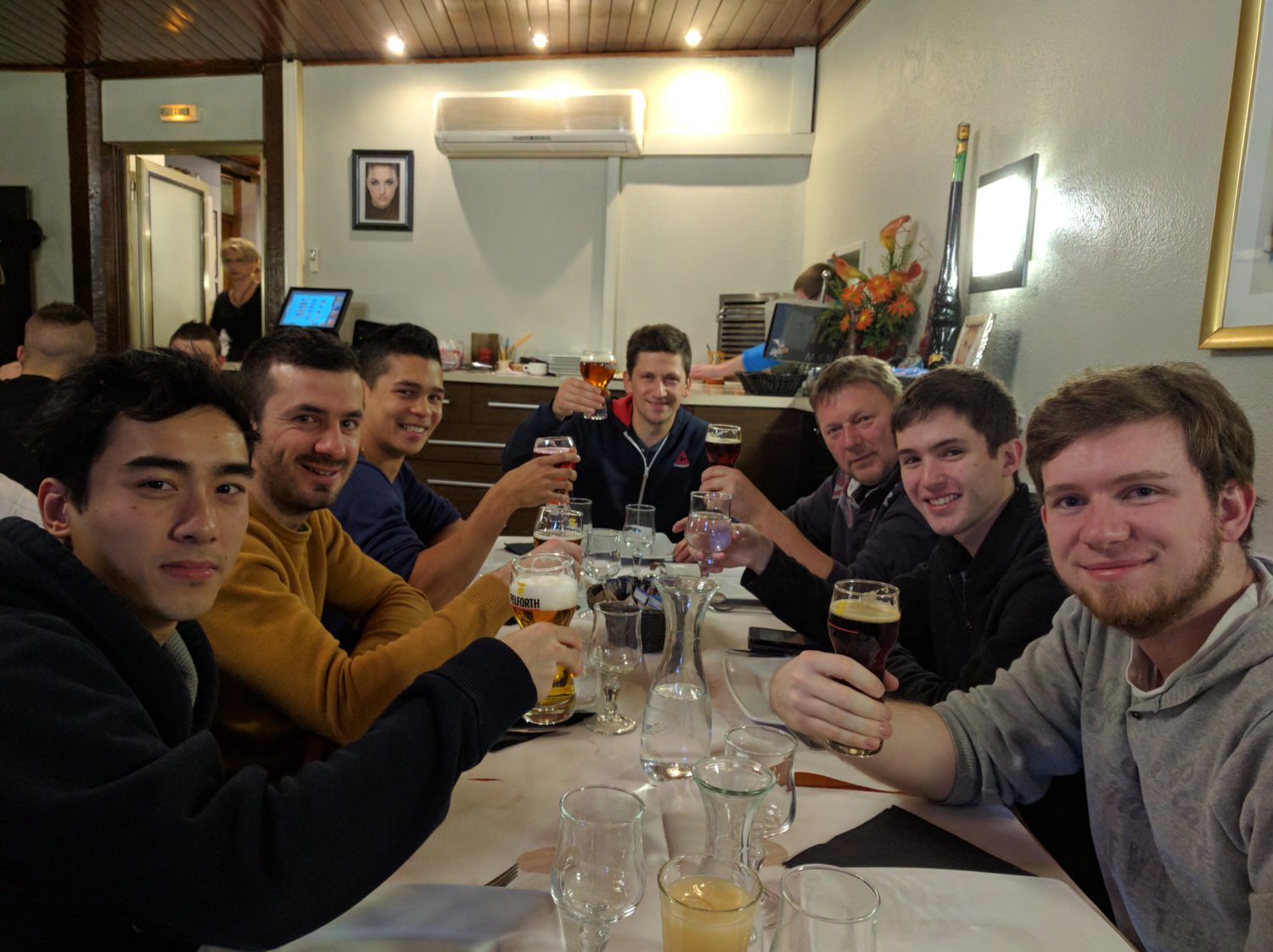 En vrac, côté sportif : Thomas a fait un énorme match avec (et pas contre) Hervé – le jeune Maurice était impressionnant, ce serait bien qu’il joue rapidement en équipe 1 à Illzach – Fufu n’aura plus le droit de faire de chantiers le matin des journées de match – Tom s’est ressaisi contre Hervé mais un peu tard – Gilles devra se coucher plus tôt – Jean a changé de coupe de cheveux mais pas de revers – on a perdu trop de belles surtout qu’on a chacun remonté deux sets pourfinalement perdre au 5e – oui Christophe, l’orthaugrafe, c’est important – Fufu, tu as fait un gros dodo ? – bravo au Racing, ils devraient monter en R1 élite et ils le méritent bien.