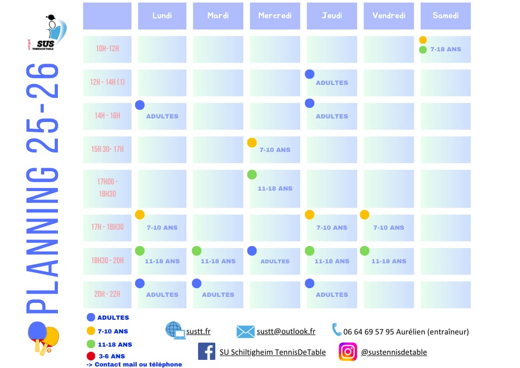 Le SUS Tennis de Table vous accueille tout au long de la semaine avec des créneaux adaptés à tous les âges et tous les niveaux ! Que vous soyez débutant, joueur loisir ou compétiteur, notre club propose différents groupes pour progresser à votre rythme :